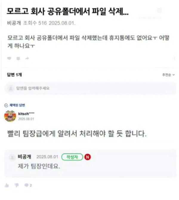 실수로 회사 공유 폴더 삭제한 직원